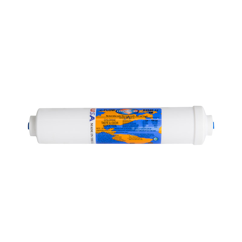 Omnipure K2540 in-line water filter. Easy to fit with quick connecting push in 1/4″ tube / hose fittings built into each end K2540 JJ or choose the K2540 BB if you require a 1/4 inch female thread to screw your own fittings into. Most widely used as a external inline fridge filter or as a polisher for reverse osmosis systems. Reduces Dirt & Sediment, Chemicals, Chlorine, bad tastes & Odours. Rated at 5 microns. Maximum service life is 1500 Gal, Maximum pressure 125 psi, Dimensions 285mm overall x 50mm. Excellent reduction rates for quality drinking water and ice. Made in the USA. NSF approved. The best inline water filters in the world, pure and simple.